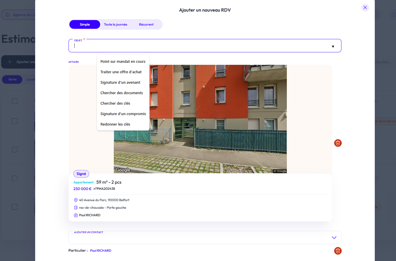 L'objet du RDV sera déja personnalisé selon le module ou vous êtes. Ainsi, Realty ici ne vous propose que des objets en lien avec l'estimation. Bien sur, vous pouvez saisir un motif libre de RDV.