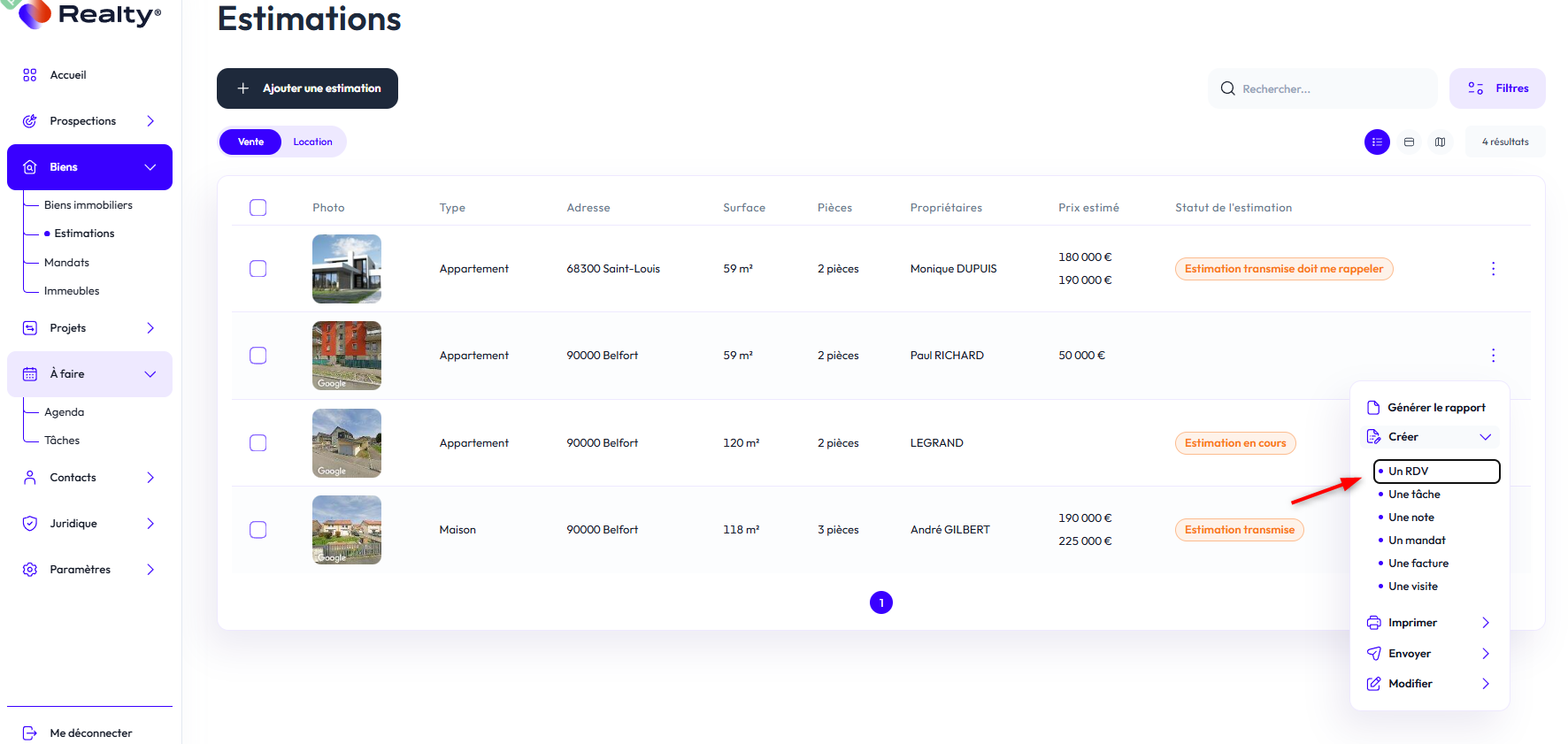 Dites à Realty a quelle adresse vous souhaitez avoir RDV, vous avez le choix entre l'adresse du bien, de l'agence, du propriétaire ou une autre adresse libre.