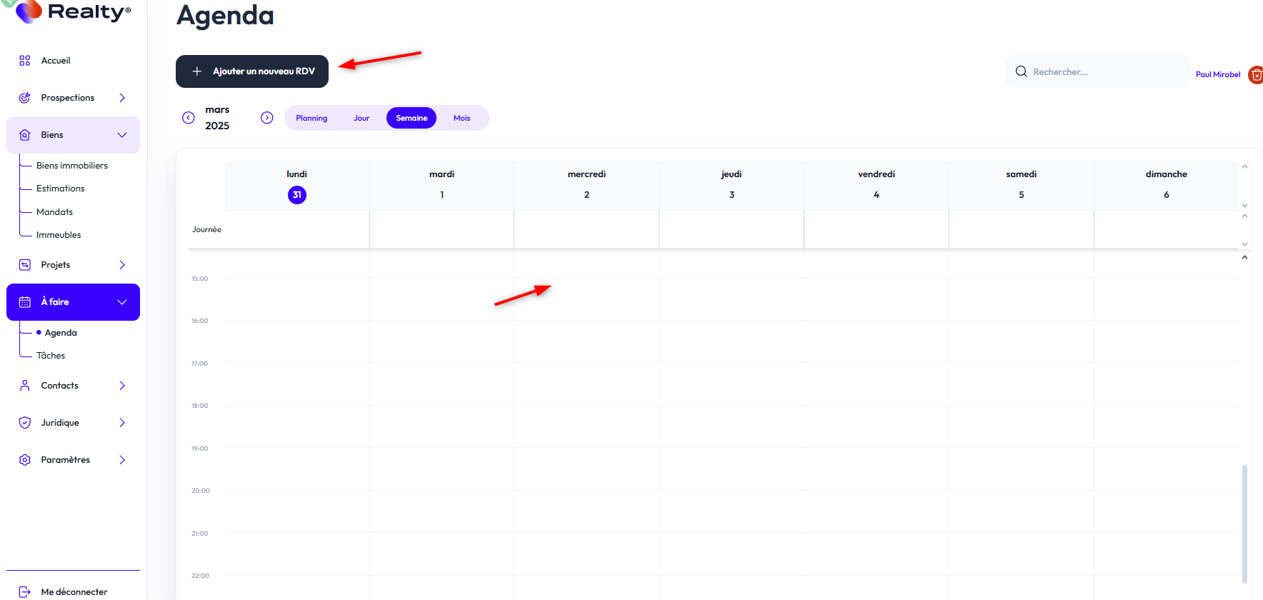 Il est également possible de créer un RDV directement depuis votre agenda, cliquez sur une plage de libre dans l'agenda, ou cliquez en haut à gauche sur "+ Ajouter un nouveau RDV".