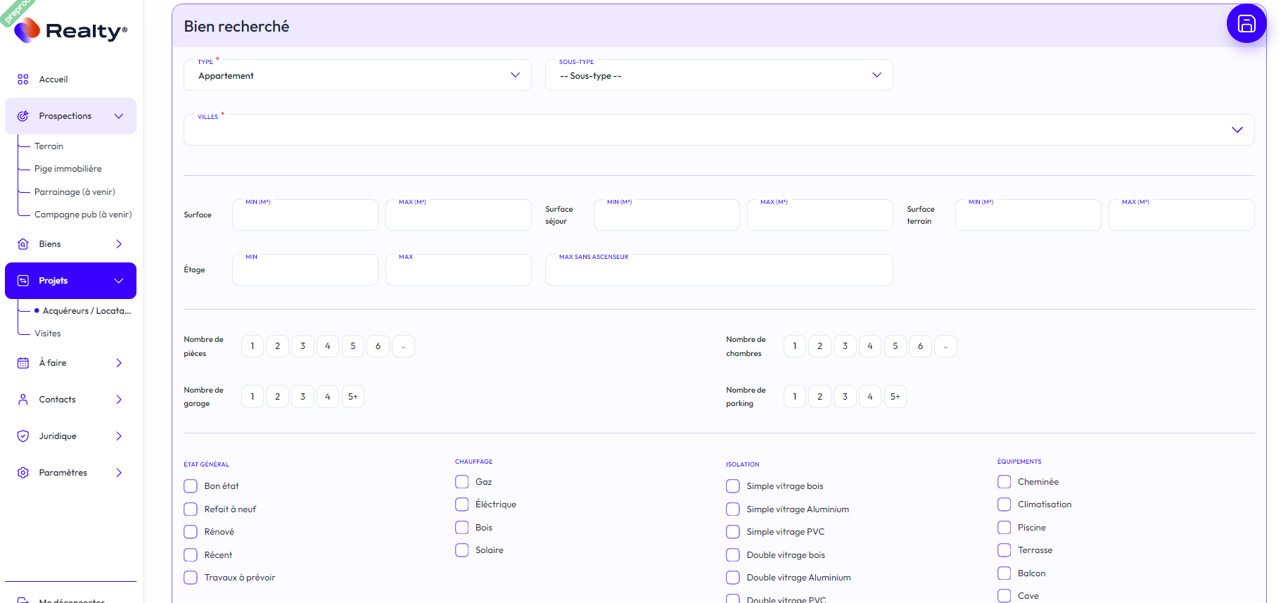 En dessous du projet, renseignez le bien recherché par votre acquéreur/locataire. Plus vous apporterez de précisions, plus Realty pourra faire le rapprochement sur des affaires correspondantes.