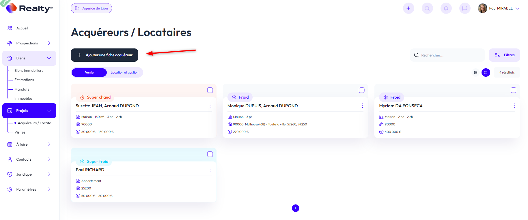 Lorsque vous avez un potentiel acquéreur en pleine recherche de bien, vous pouvez dans ce module créer et gérer des acquéreurs/Locataires. Plus vous complèterez la fiche, plus Realty pourra faire le rapprochement avec des bien cohérents que vous pourrez proposer à ces futurs acquéreurs/locataires.