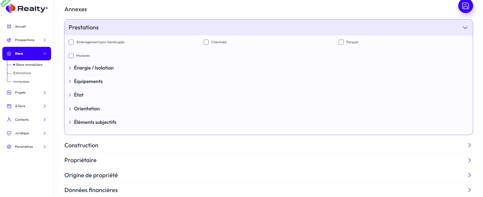 Dans cet onglet, ajouter des précisions sur les aménagements, les équipements, l'état, l'orientation du bien, ainsi que d'autres éléments qui permettent de catégoriser le bien. Attention, plus vous remplirez d'informations, plus les recherches des futurs acquéreurs seront pertinentes.