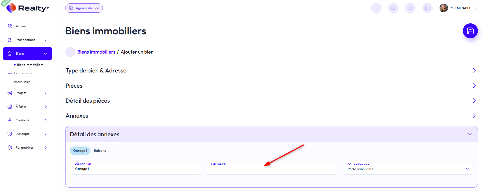 De la même façon que les pièces, vous pouvez ajouter des annexes (garages, balcon, cave...etc), puis préciser la surface.