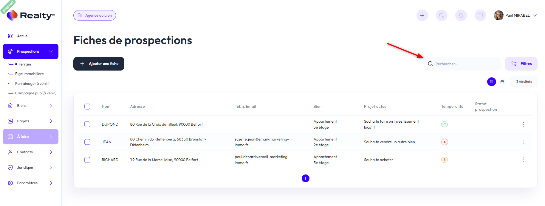 Pour effectuer une recherche et retrouver une fiche, vous pouvez saisir un nom, une adresse, ou un mail par exemple.
