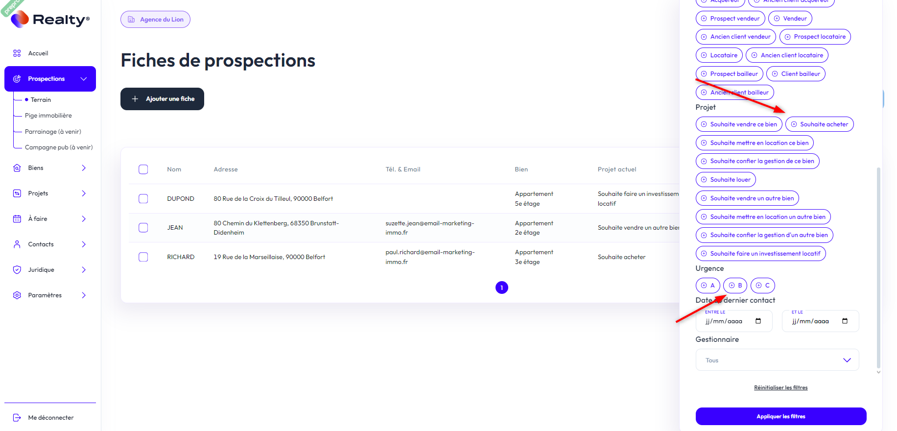 Vous avez par exemple renseigné plusieurs prospects qui souhaitent acheter dans quelques mois. Vous pourrez les retrouver dans la liste en cochant le filtre "Souhaite acheter" et en cochant le niveau d'urgence "B".