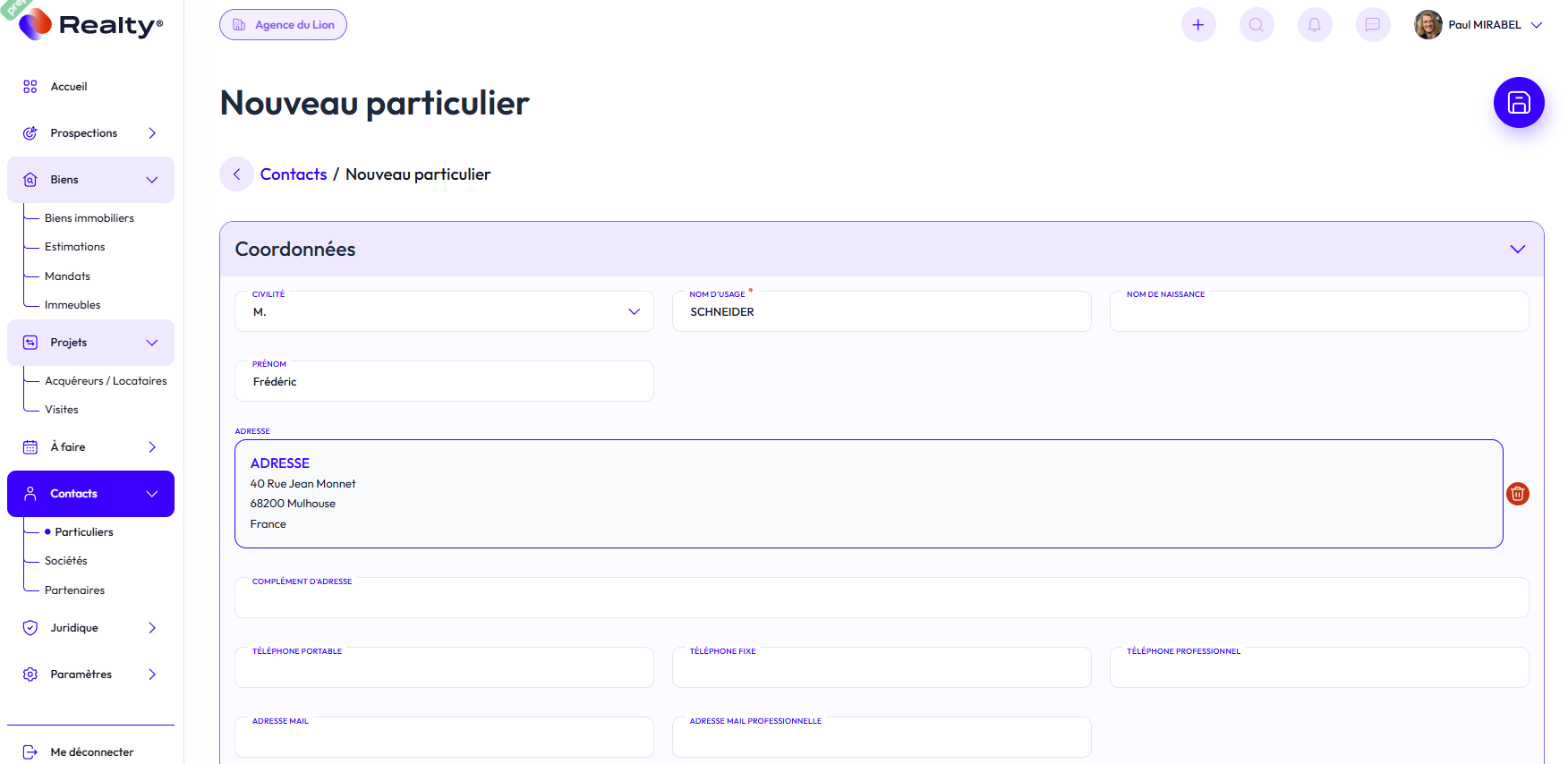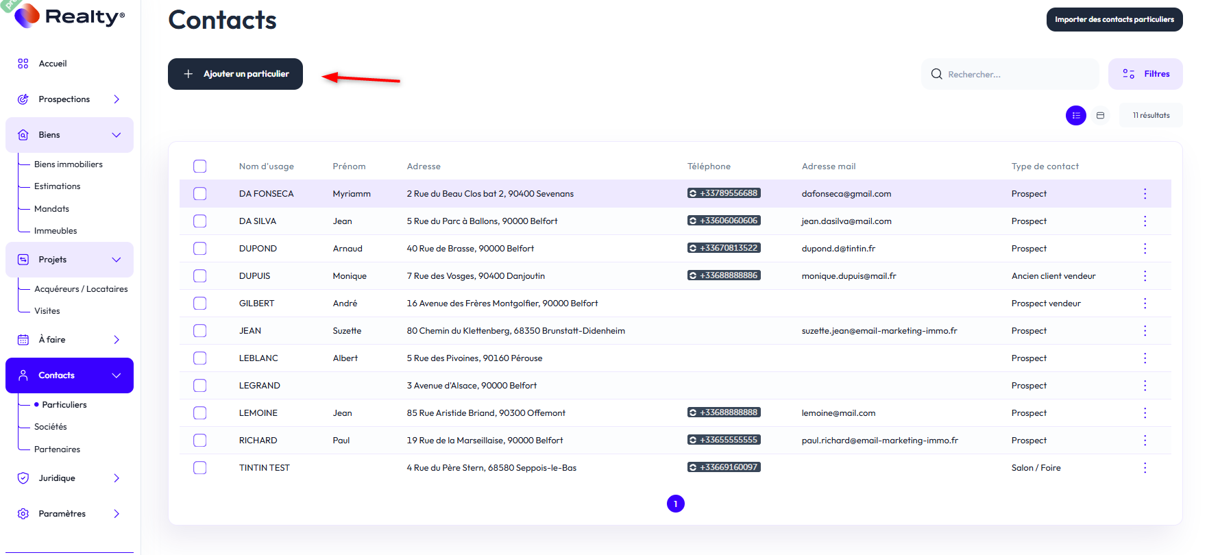 Pour créer un contact particulier, cliquez sur "+ Ajouter un particulier"