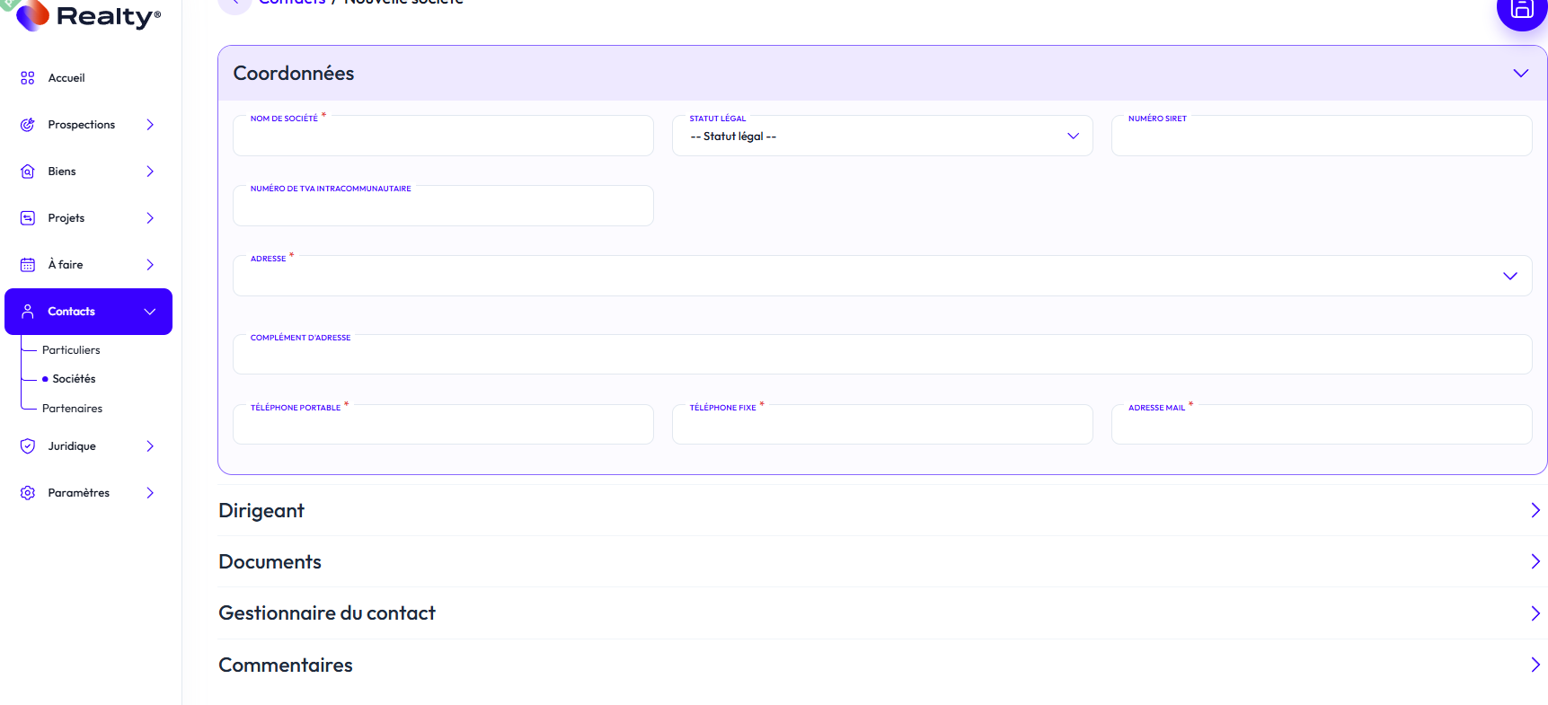 Saisissez la profession, si vous ajoutez une entreprise que Realty ne connait, il vous proposera de créer la fiche société