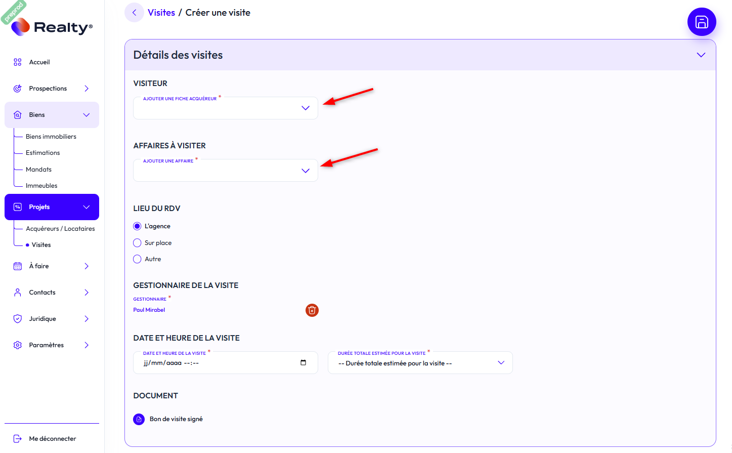 Si ces informations ne sont pas déja présentes car elles ont été reprises de la fiche acquéreur/de l'affaire, vous devez saisir une fiche acquéreur ainsi que l'affaire à visiter.