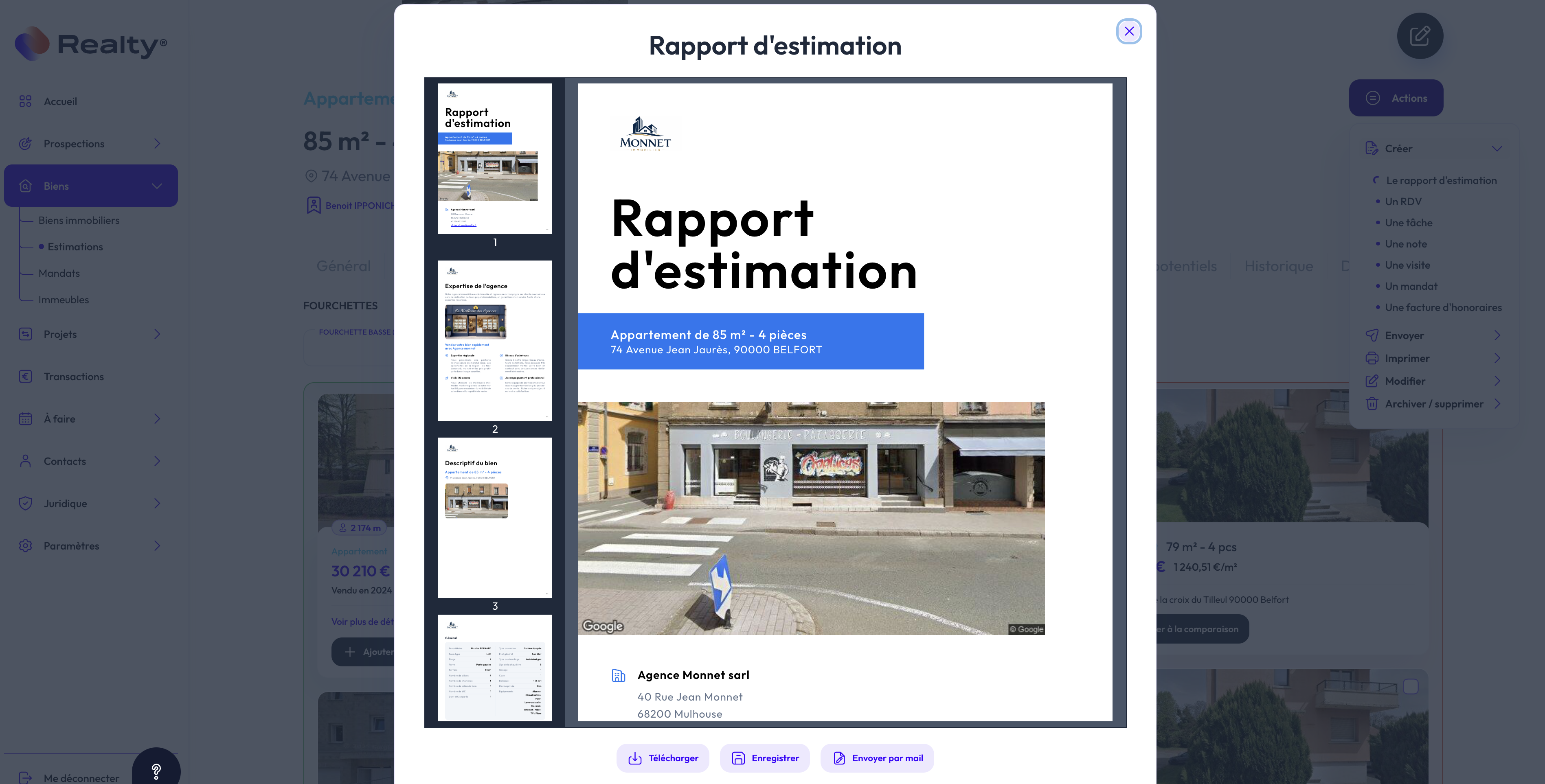- Votre rapport d'estimation se génère automatiquement avec toutes les données que nous avons vu précèdemment, ainis que l'estimation par comparaison, les dconnées démographiques du quartier, les Points d'intérêt à proximité, etc..