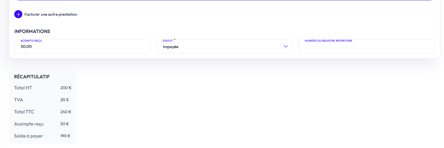 En dernier lieux, indiquez si il y a eu un acompte, modifiez le statut de la facture (payé/impayé) ou même le numéro du registre répertoire si vous en avez un. Un récapitulatif est présent pour avoir un visuel global de la facture avec le solde final à payer.