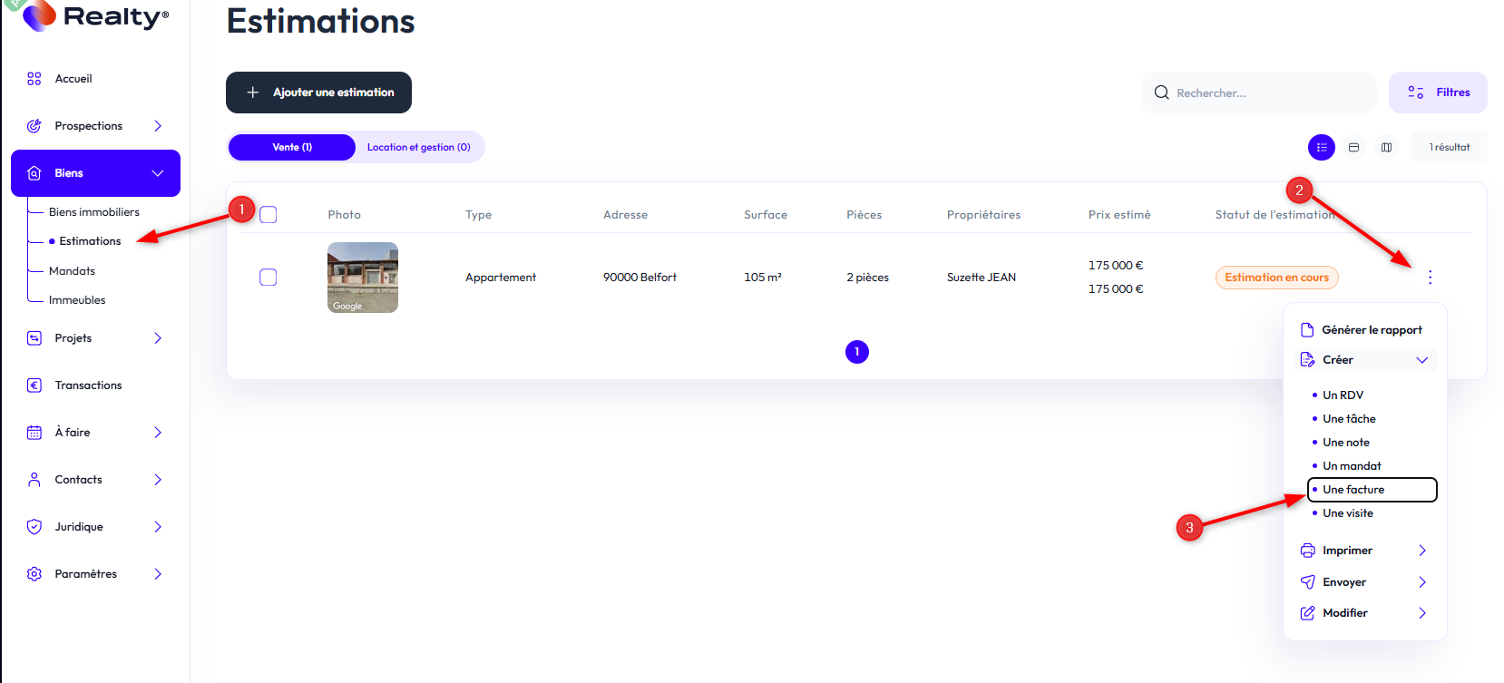 Par exemple, avec l'estimation, cliquez sur l'onglet "Estimations"(1), cliquez sur le bouton d'actions de l'estimation (2), puis sur Créer "un facture" (3)