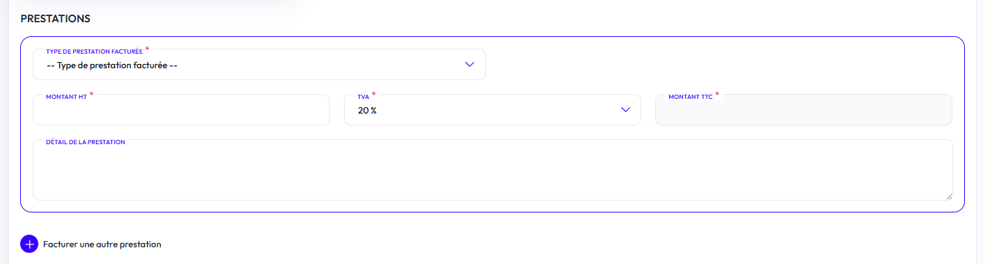 Dans la partie prestation, vous devez ajouter au moins un type de prestation (une ligne sur la facture), le montant HT, la TVA appliquée, et éventuellement le détail de la prestation. Le montant TTC se calcule automatiquement. Vous avez la possibilité d'ajouter autant de prestation supplémentaires en cliquant sur "+ Facturer une autre prestation".