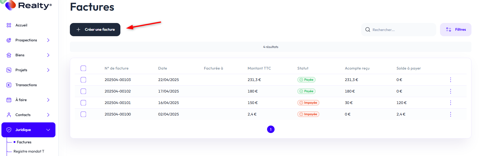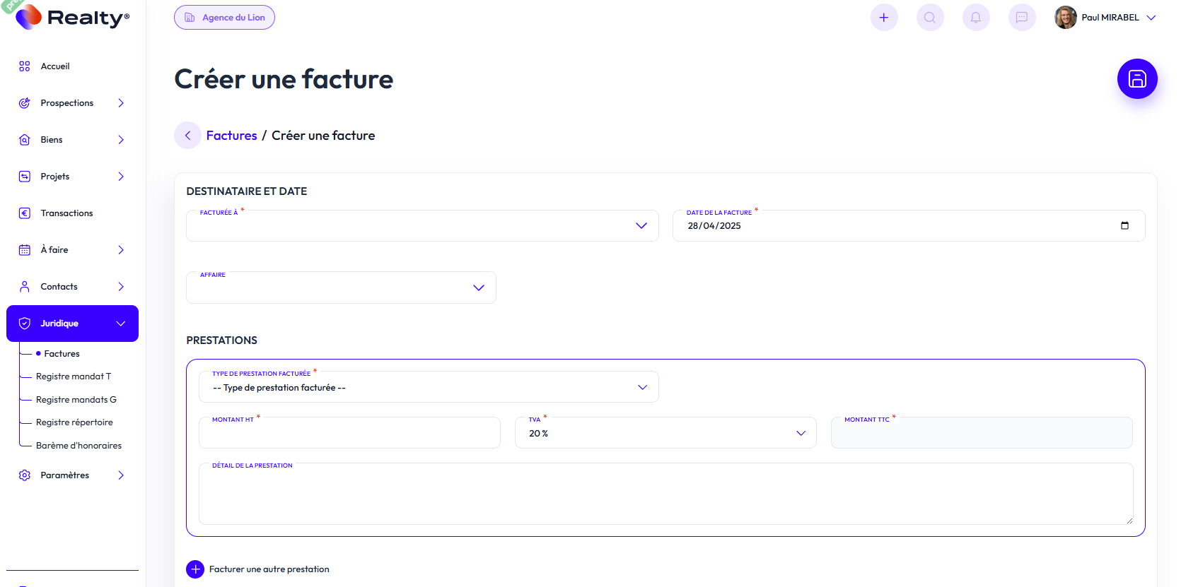 Realty vous permet de créer des factures simples et de vous faciliter la saisie selon l'endroit à partir duquel vous la générez
