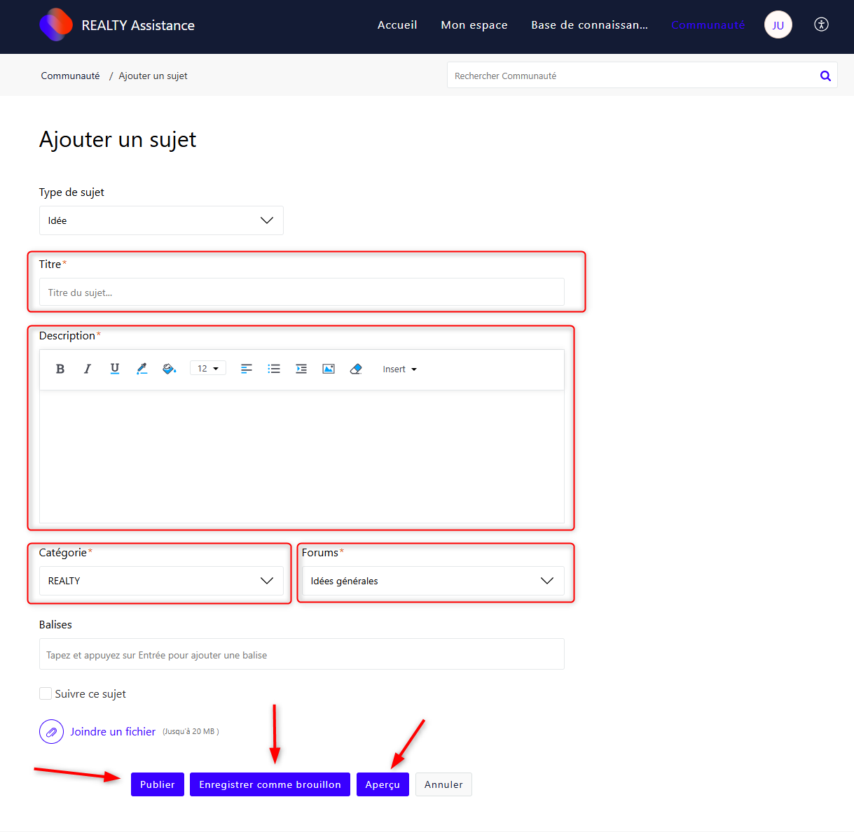 - Renseignez les informations nécessaires, telles que le titre, la description, la catégorie et le forum associé, afin de classer correctement votre proposition et d’en garantir la visibilité avec la communauté. Vous pourrez vérifier l'aperçu de votre proposition avant de la soumettre.