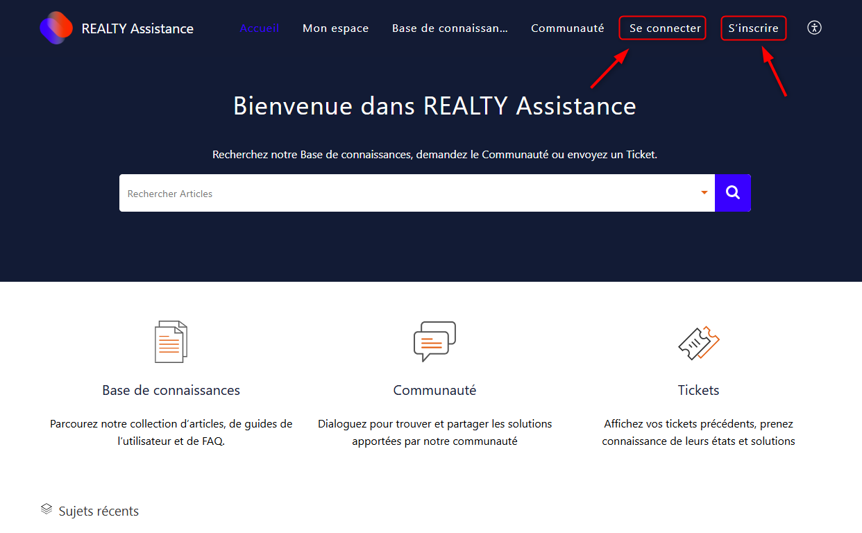 Si vous n'en avez pas, cliquez sur "S'inscrire" pour saisir votre email et nom, vous recevrez alors un email qu'il vous faudra valider pour créer votre nouveau mot de passe (attention, le compte n'est pas relié à votre compte REALTY)